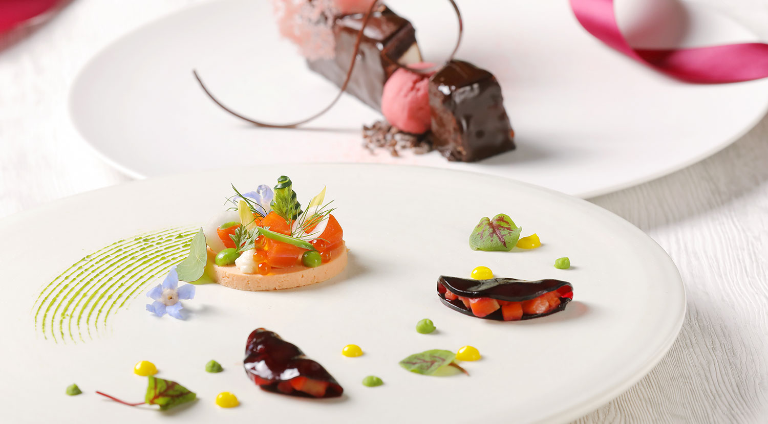 シグネチャーレストラン「アトリエ」では、旬の味覚と地元食材を贅沢に使用したメニューをストーリー仕立てでお召し上がりいただけます。シェフたちが織りなす優美な料理とともに、おふたりだけの格別の時間をお過ごしください。